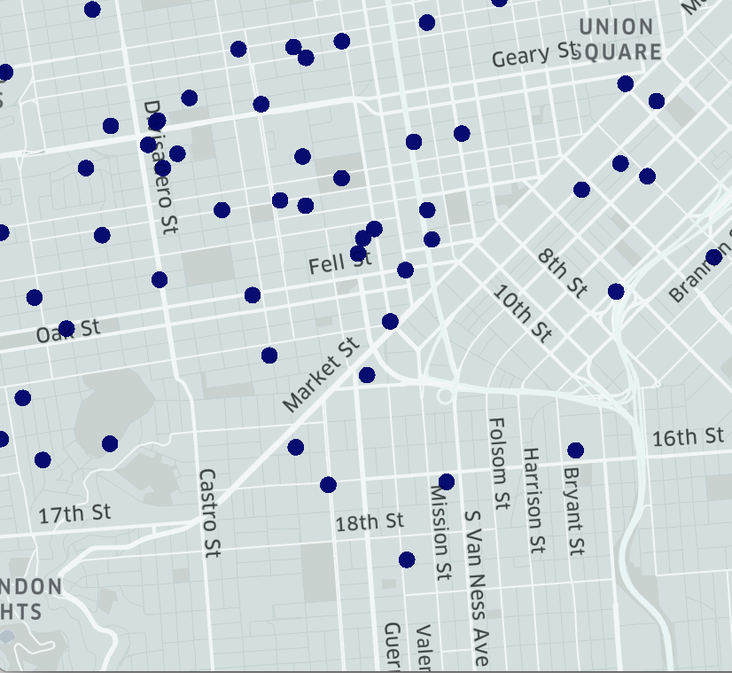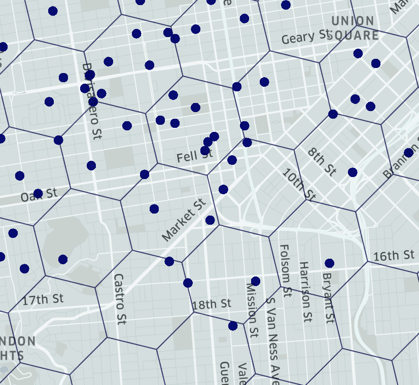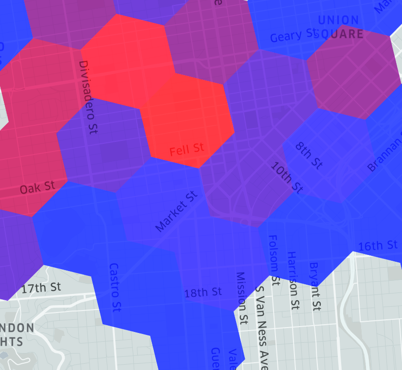 Figure 2 depicts this process of bucketing; grouping locations and other geospatial manipulations into hexagons with hierarchical properties. The example in Figure 2.3 depicts the areas with higher density of vehicles in coral and lower density in blue.